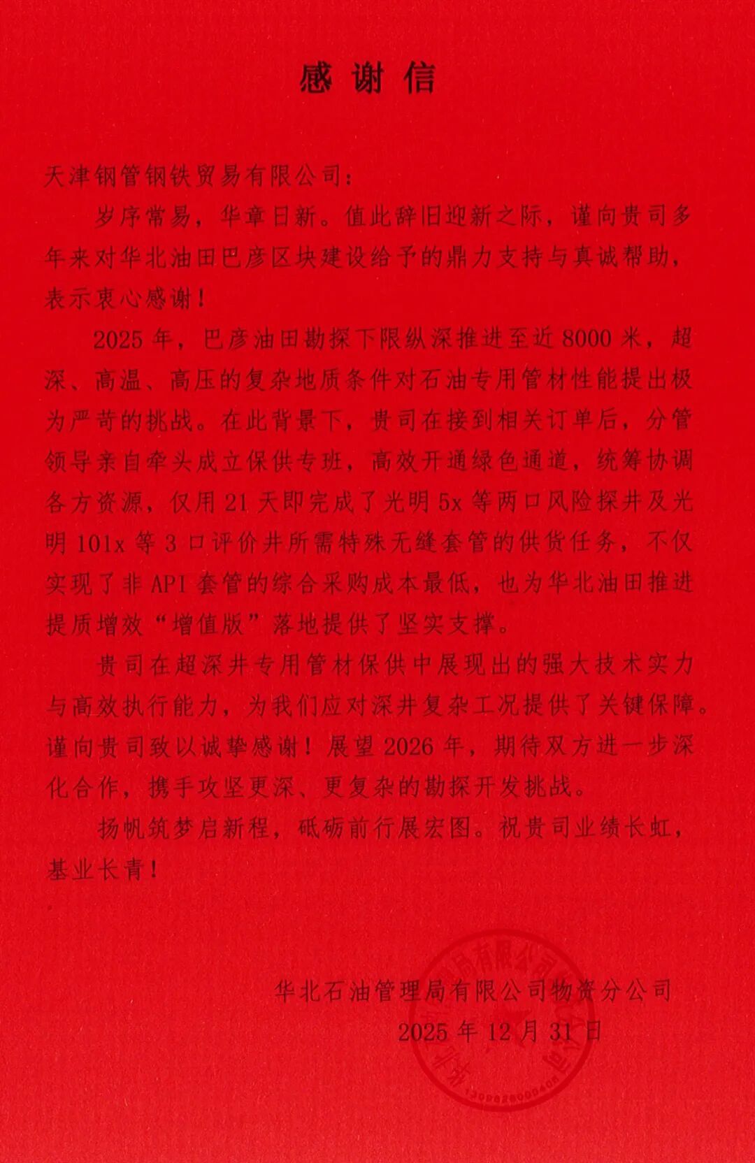 2025年12月31日,中国石油华北油田发来感谢信,对天津钢管克服重重困难,保质保量如期交付高品质TP系列特殊扣套管,有效解决了该重点项目急需一批特殊型号无缝套管的燃眉之急,给予充分肯定和高度赞扬。
